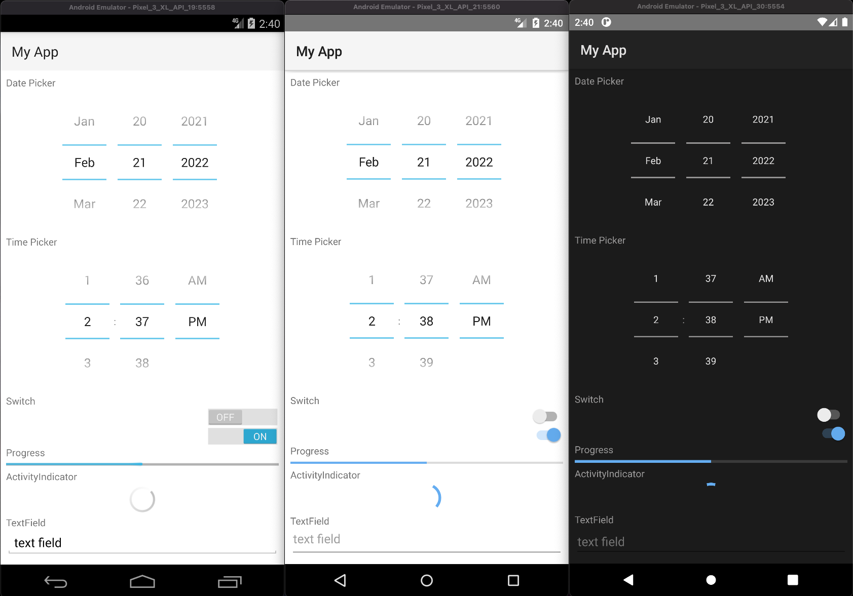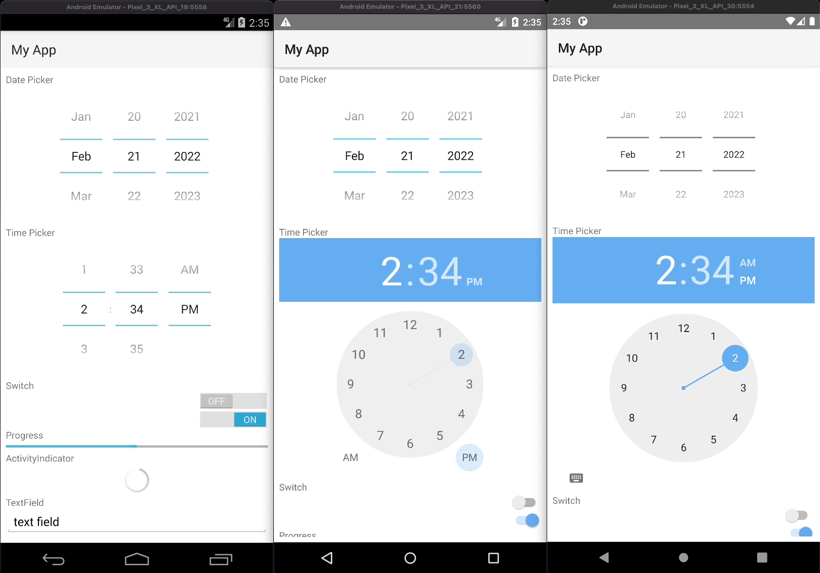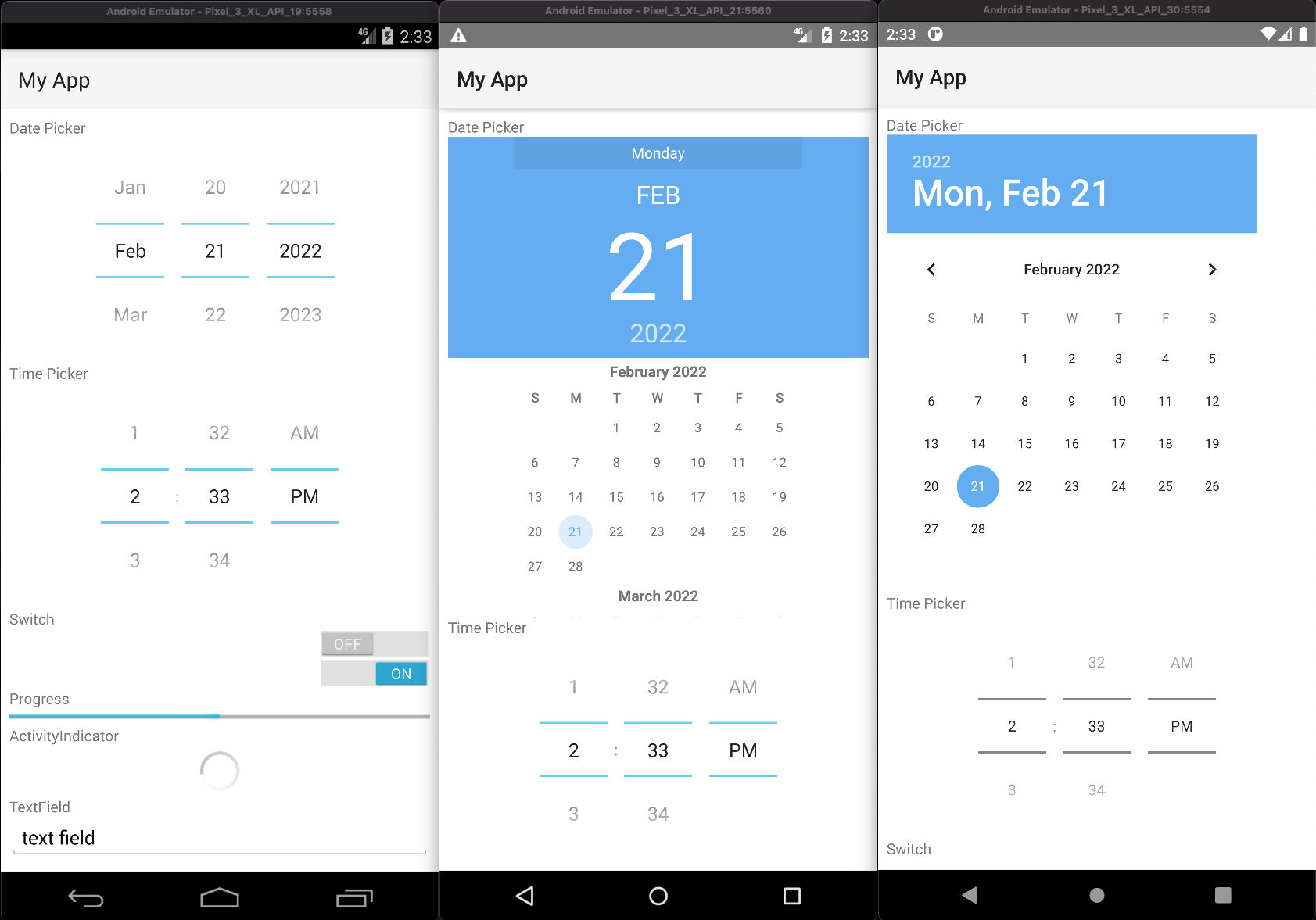 To change the mode of the DatePicker from the default spinner style, change android:datePickerMode in App_Resources/Android/src/main/res/values-v21/styles.xml: